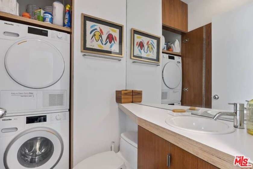 ***HUGE PRICE REDUCTION*** Previous owner paid over $1,400,000. .Rarely available LIVE/WORK in the best part of Abbot Kinney! Experience a truly walkable lifestyle in this architectural mixed-use building. Located just blocks from the beach on Abbot Kinney Blvd with its vibrant shopping and dining scene, this tasteful, minimalist apartment gets tons of natural light from large windows offering iconic L.A. views of palm trees. Situated one floor above a vibrant streetscape and accessed via a private garden courtyard, the lower level consists of an open living/dining and kitchen area, powder room and terrace. Upstairs is a bedroom, the primary bath and a study that can also function as a second bedroom. High-end features include polished concrete and Ipe wood floors, teak Euro-style cabinetry, pocket doors, Subzero and Bosch appliances, Miele washer-dryer and a garden with native plants. Unit come with two secured parking spots. s x s